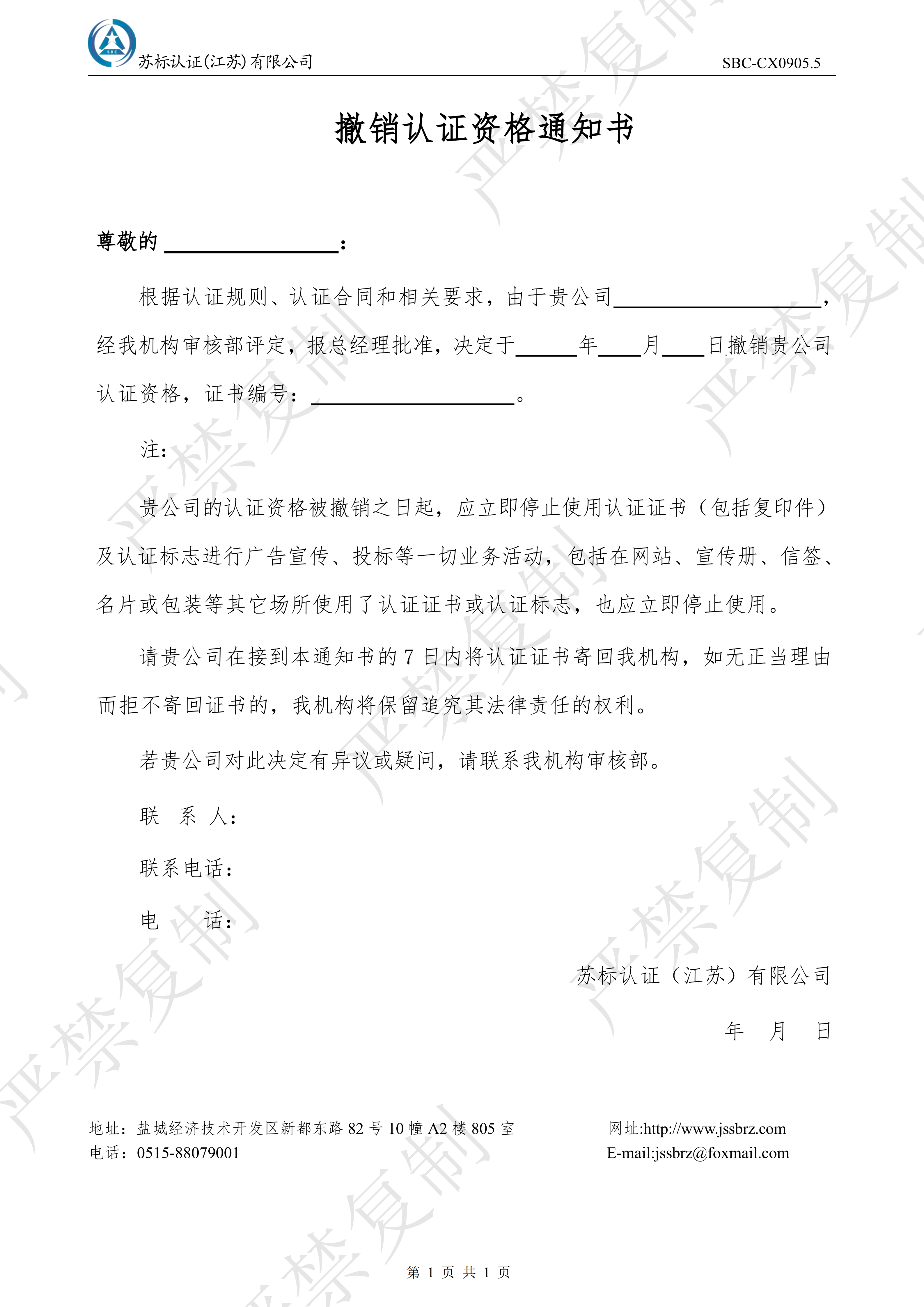 证书暂停、撤销通知书