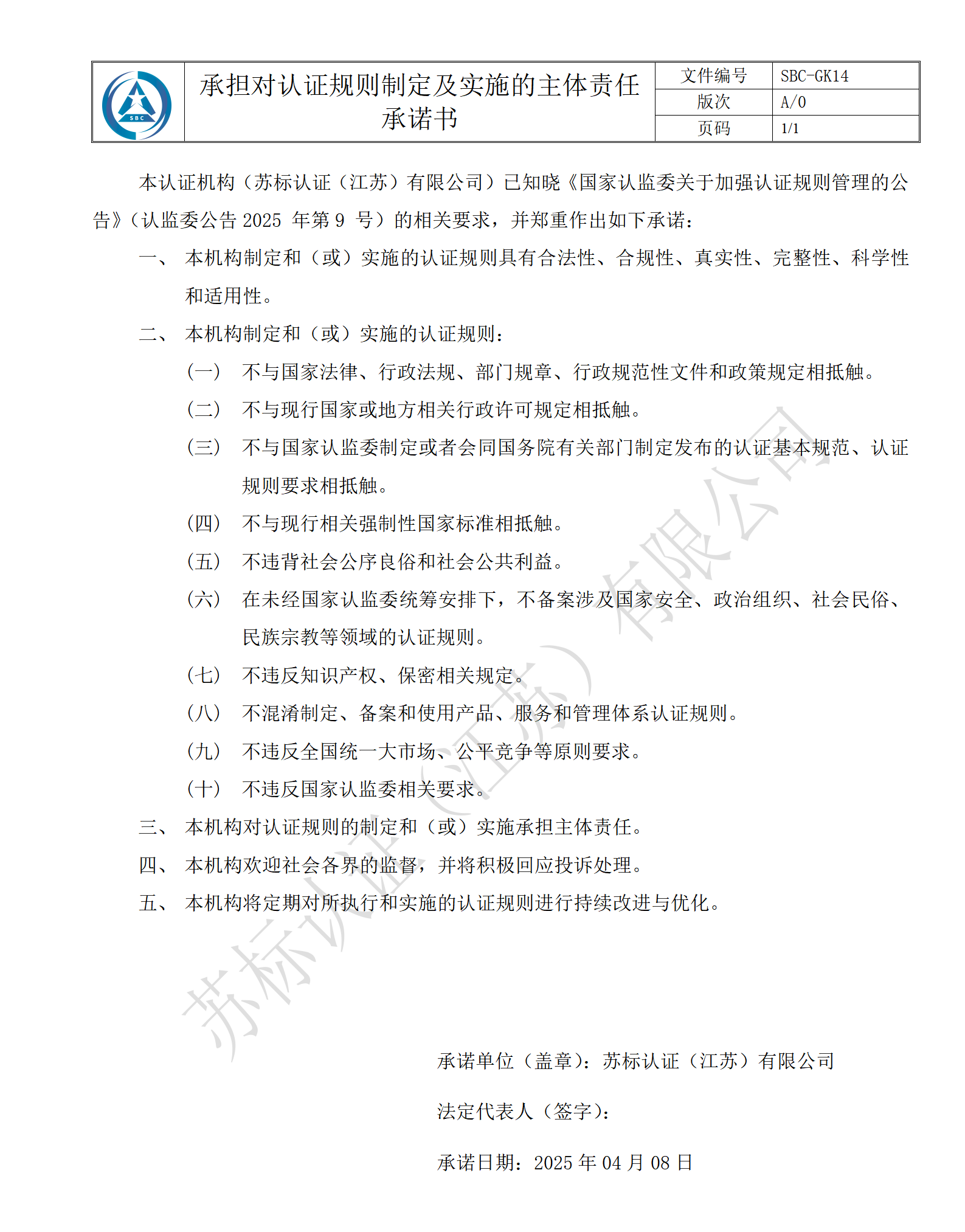 承担对认证规则制定及实施的主体责任书承诺书