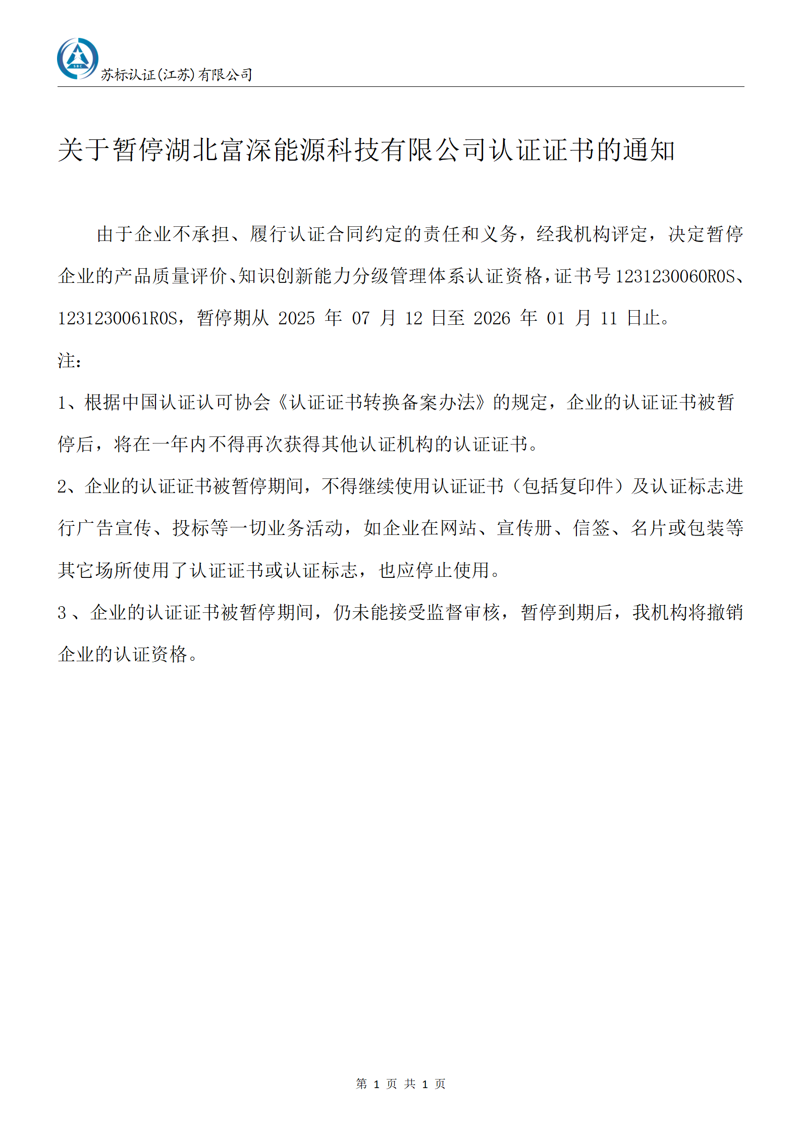 关于暂停湖北富深能源科技有限公司认证证书的通知