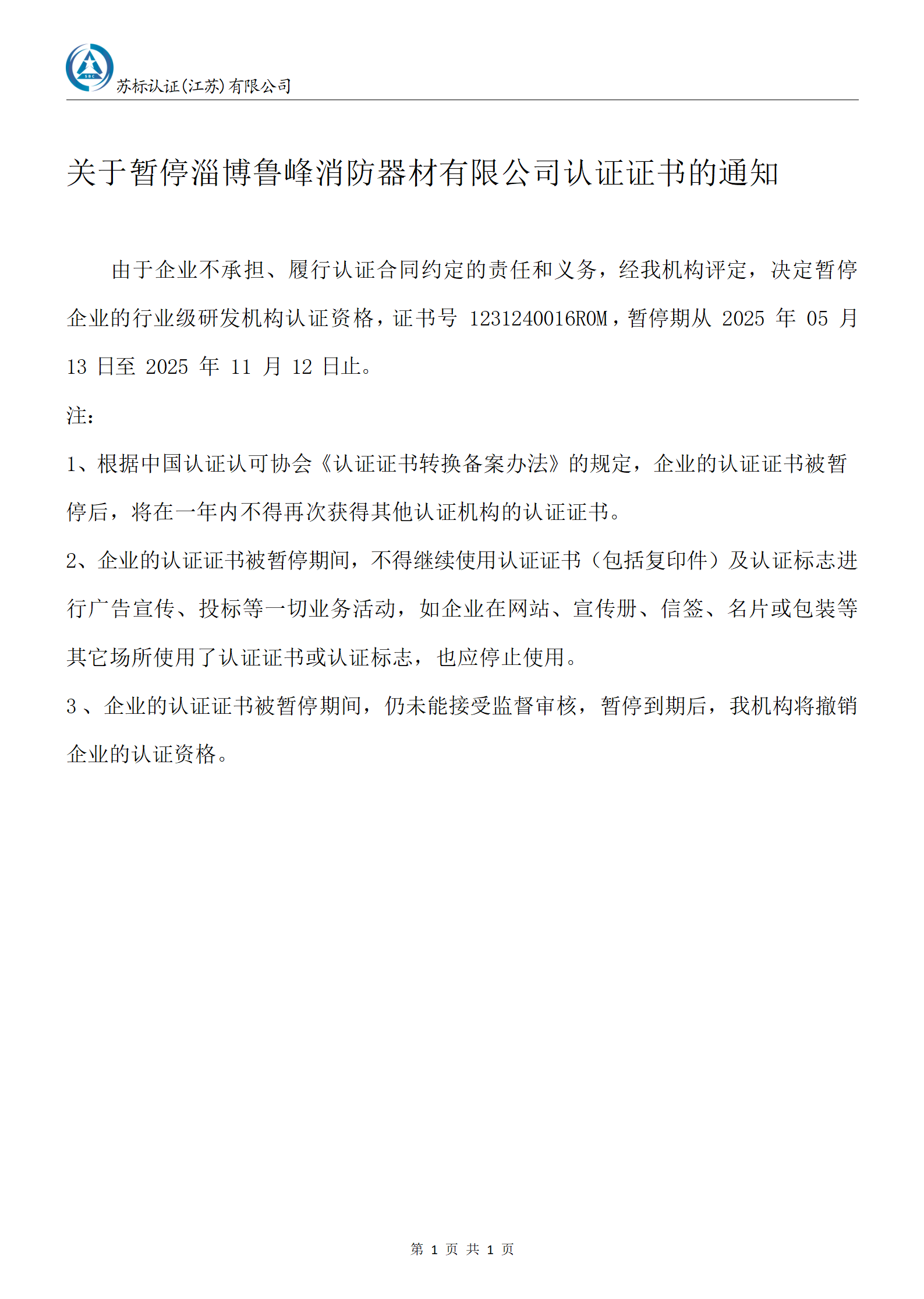 关于暂停淄博鲁峰消防器材有限公司认证证书的通知