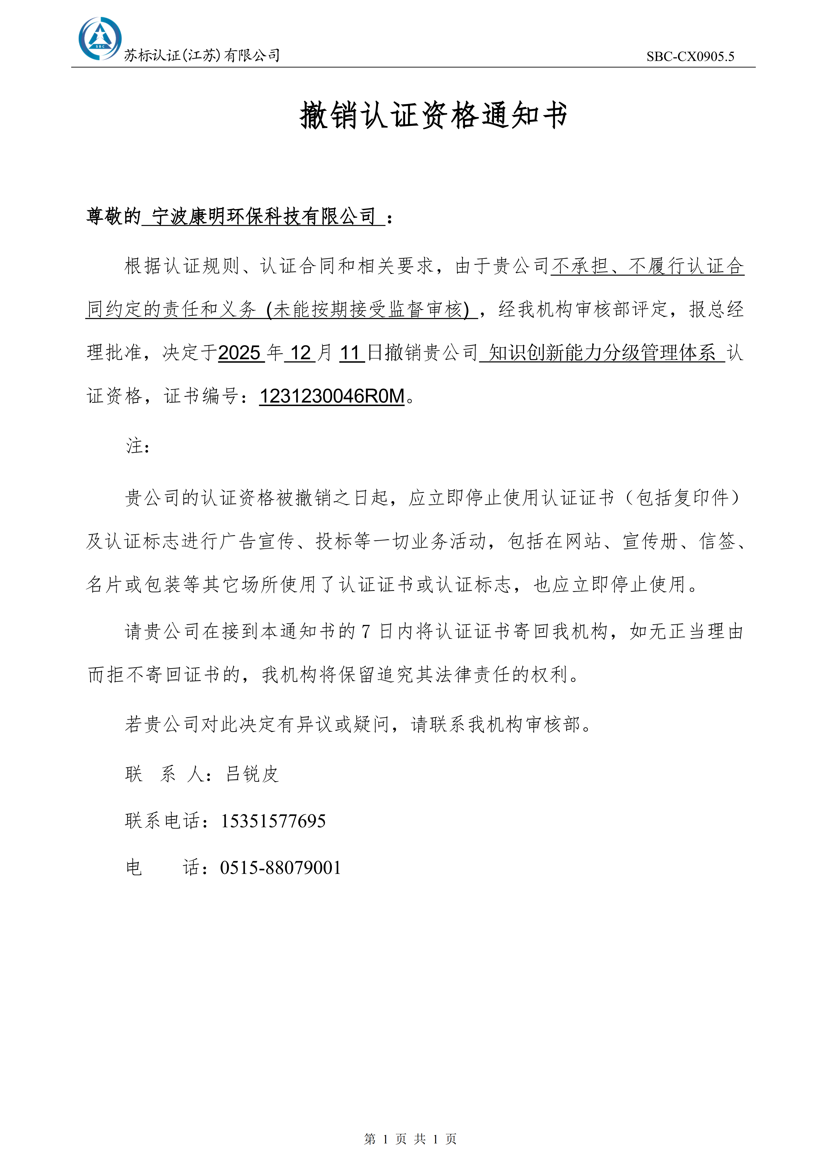 关于撤销宁波康明环保科技有限公司认证证书的通知