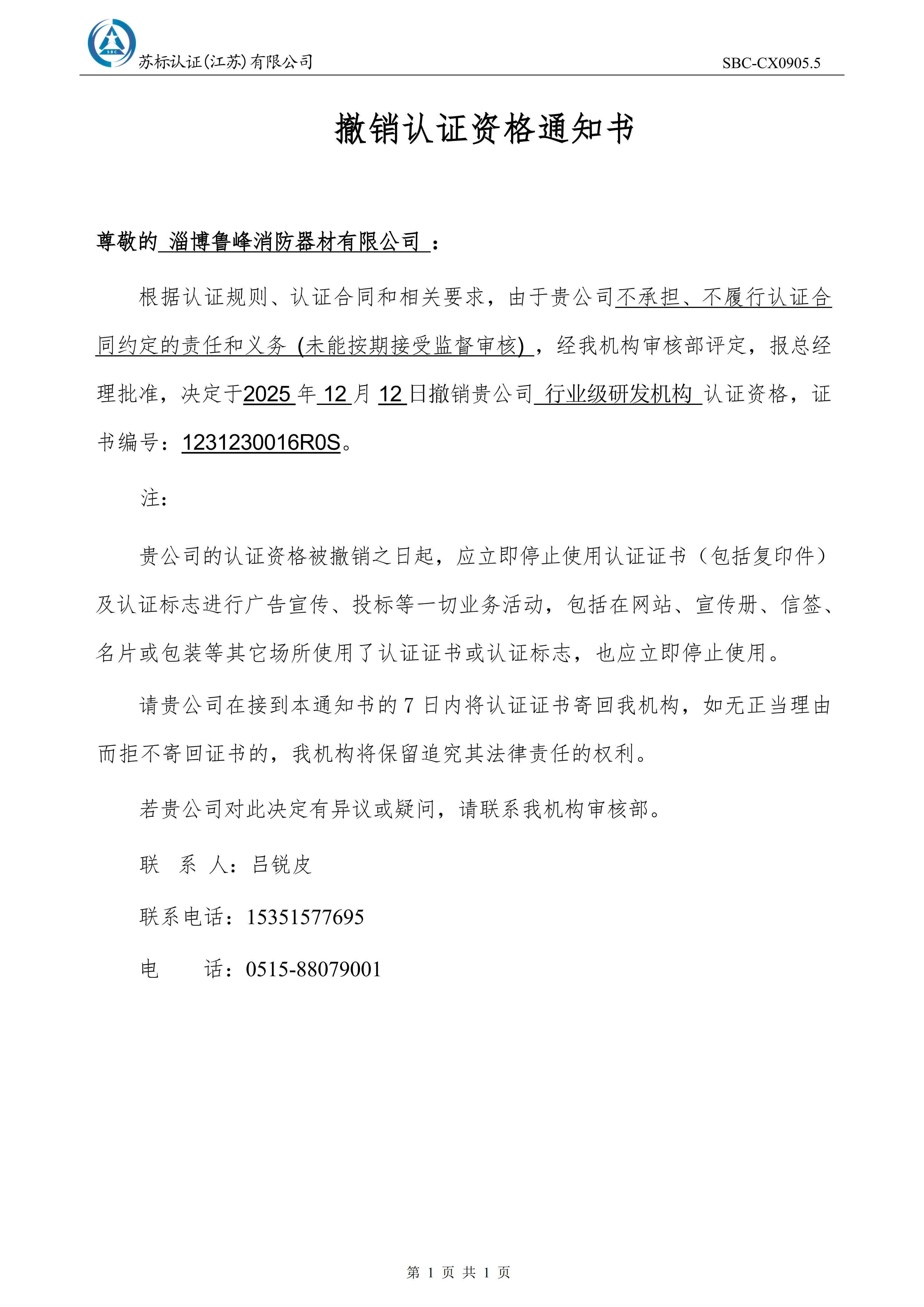 关于撤销淄博鲁峰消防器材有限公司认证证书的通知